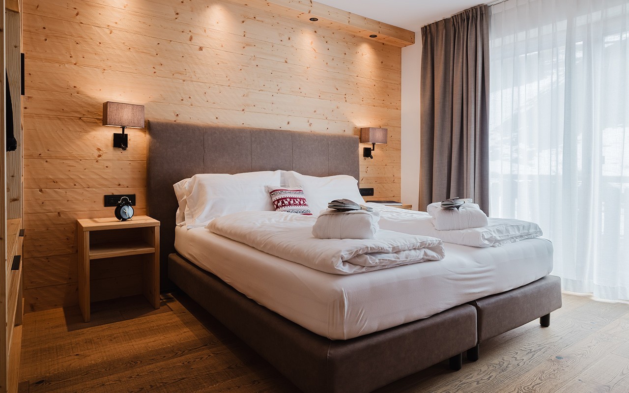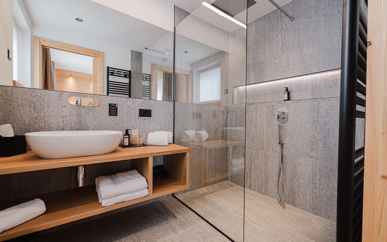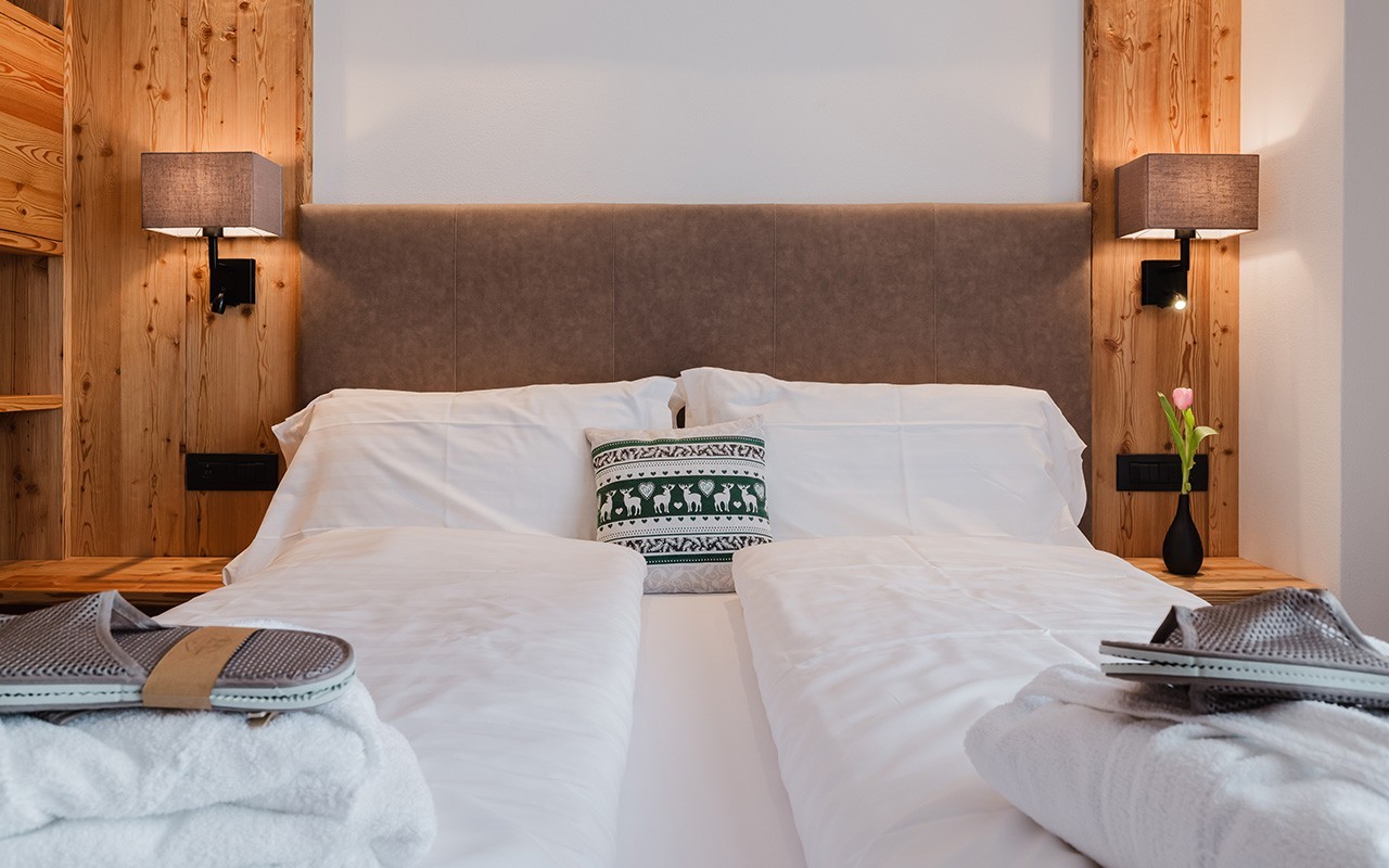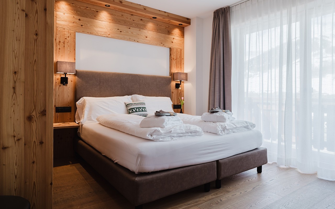 Ampia, luminosa e avvolta dal calore del legno alpino, gode di una vista straordinaria sulle montagne dei dintorni. È arredata con cura, è piena di luce. E dispone di un ampio bagno con doccia e di un balcone o giardinetto. Per riempirsi gli occhi, e il cuore, del panorama che racchiude l’hotel.