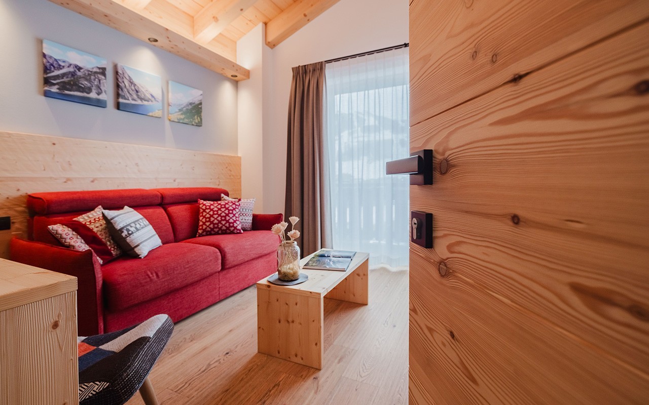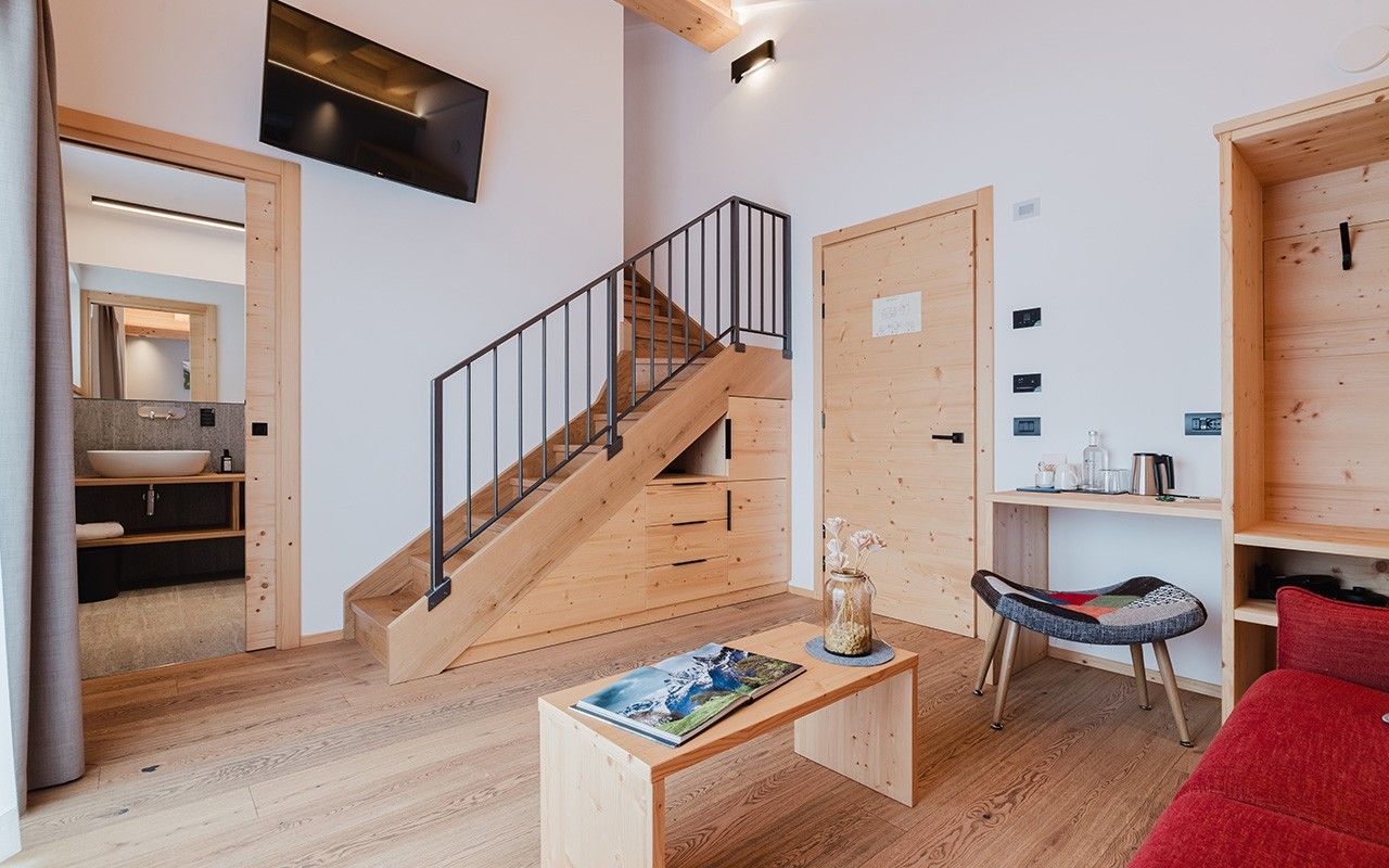 Un’accoglienza eccellente, la nostra Suite è proprio questo: una stanza su due piani per chi vuole vivere tutto il fascino d’una casa di montagna godendo di ampi spazi e zona living.
